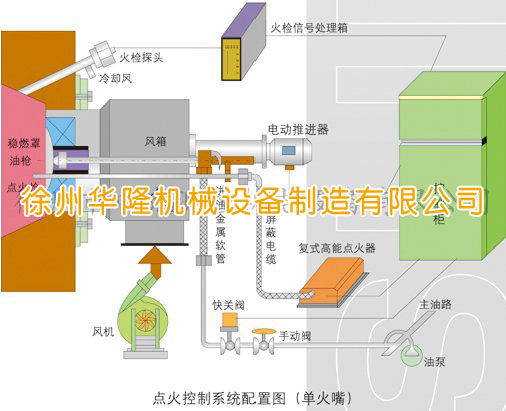 本系統(tǒng)由就地點火控制柜(SKDK)、高能點火裝置、火焰檢測裝置、油燃燒器推進執(zhí)行器和球閥組成。點火柜按用戶要求可以采用繼電器或可編程控制器PLC為核心。系統(tǒng)可自動(接受集控室指令)或手動(現(xiàn)場就地)控制。點火設(shè)備按有關(guān)規(guī)范及設(shè)定程序進行鍋爐的點火操作,并給出各種工況的就在顯示和對集控室的信號反饋。