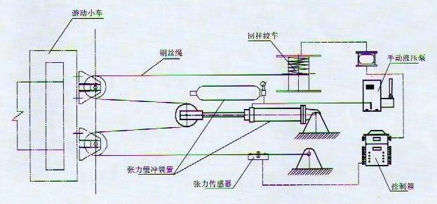本裝置主要由基座、張緊絞車、液壓張力緩沖裝置、控制箱和張力傳感器五部分組成。圖示中的鋼絲繩由用戶提供,游動小車是皮帶機部件。張緊動作可根據(jù)需要實現(xiàn)變頻控制。 該型號張緊裝置結(jié)構(gòu)簡單、經(jīng)濟可靠、為免維護型張緊裝置。可用在采煤工作面。